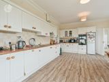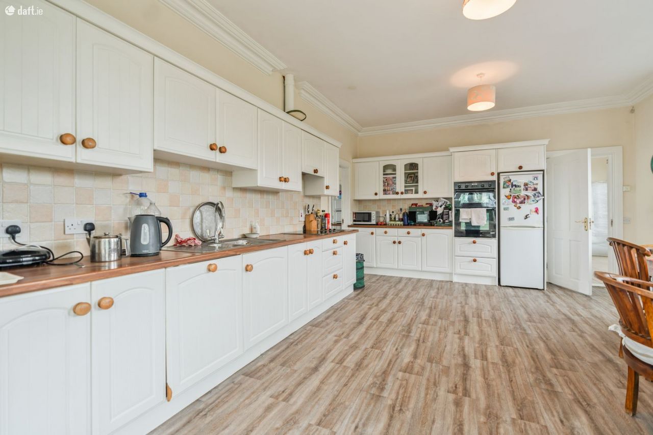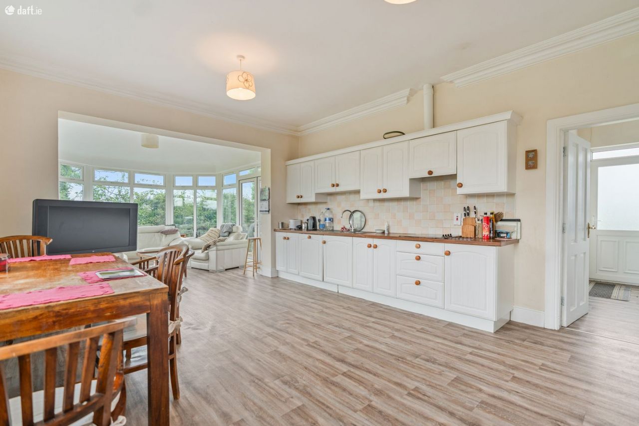 A superb family kitchen fitted with an abundance of built-in units, wood-effect linoleum flooring, and tiled splashbacks. Dual windows to the front elevate the brightness of this well-appointed space, which opens seamlessly into the adjoining sunroom.