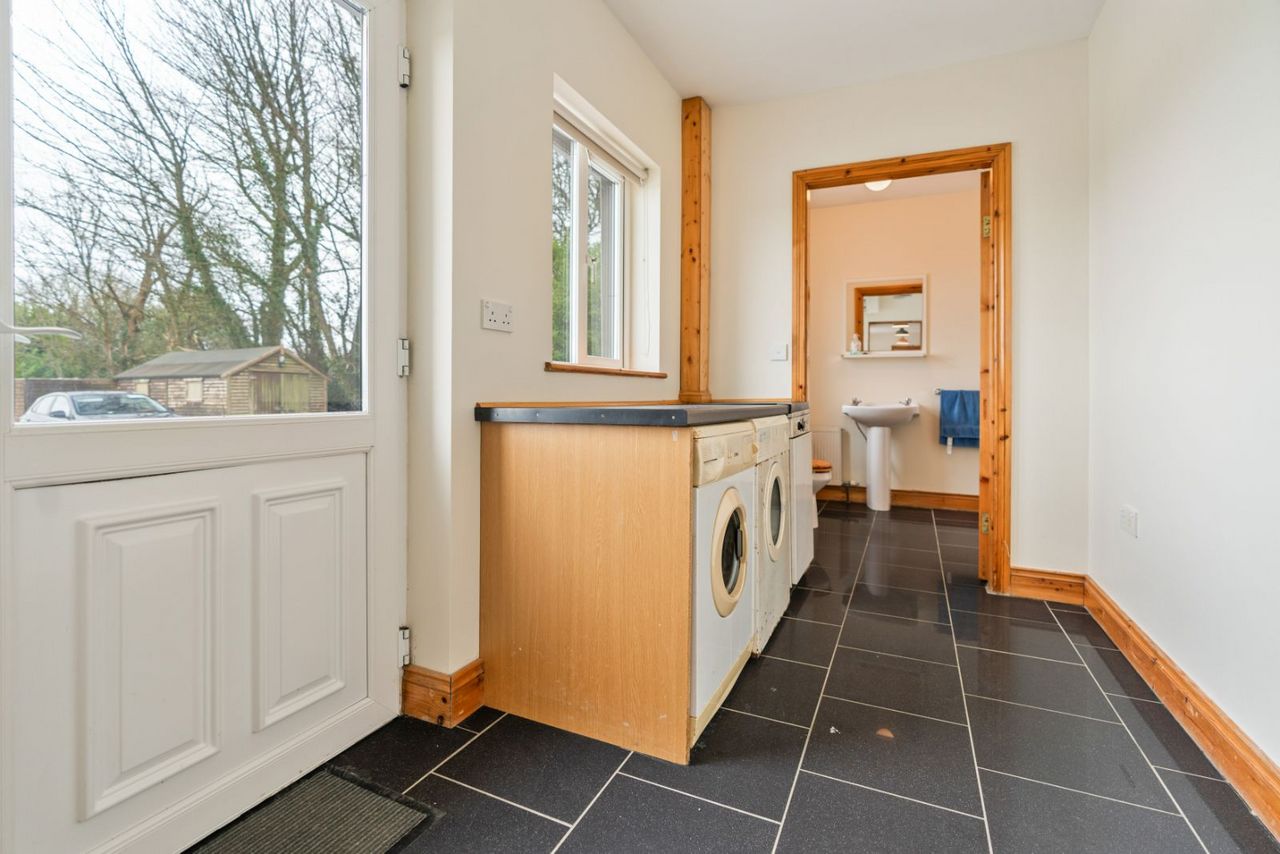 A separate utility room, also tiled, provides additional storage and laundry facilities, keeping the main kitchen space clutter-free.