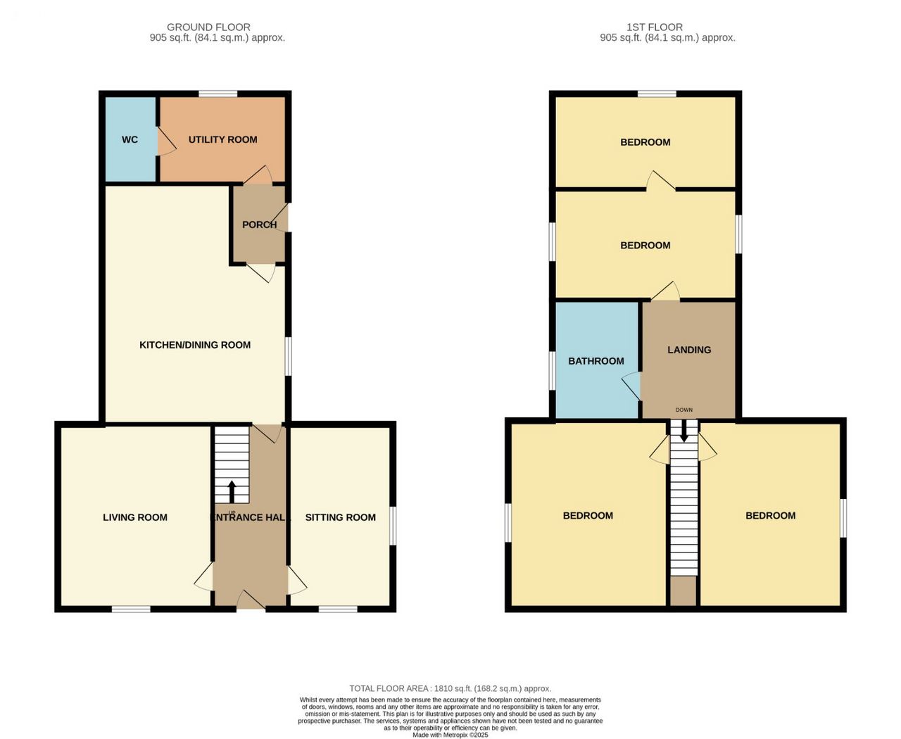 Ground Floor: Entrance hall, sitting room, living room, kitchen/dining area, porch, utility room, and guest WC